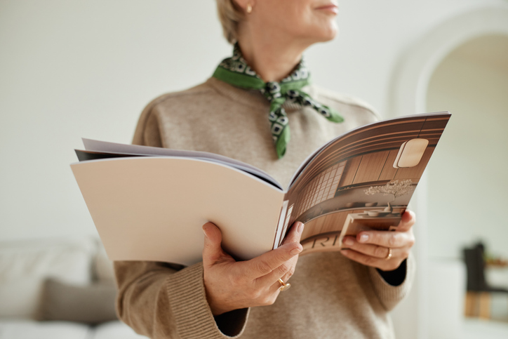 Caucasian senior woman holding open magazine with interior design images, standing indoors with partial face visible, wearing scarf around neck, reading content attentively