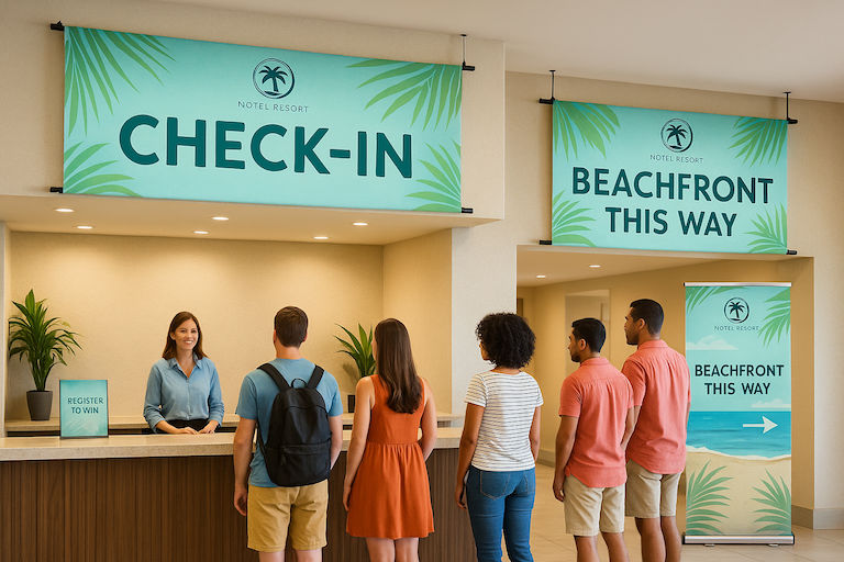 Think of floor-level retractables to point toward seasonal sections. Use hanging vinyl banners in lobbies to guide visitors to check-in or pickup areas. Because they’re easy to move and replace, banners work especially well when your layout or traffic flow changes over time.