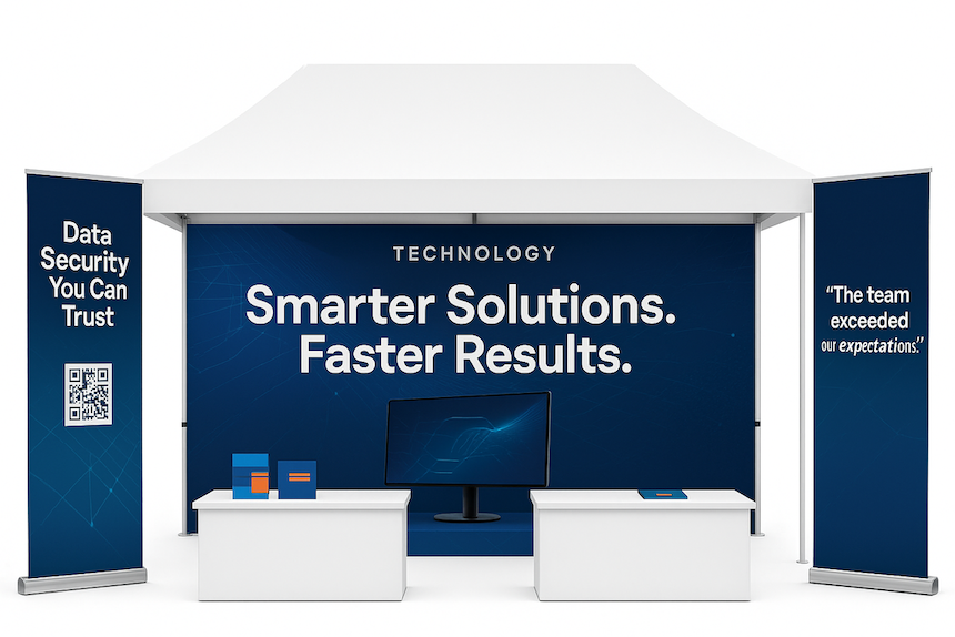 Large-format posters, retractable banners, and bold backdrops are the visual anchors that pull people toward you. A single, clear headline works better than a wall of text. Attendees should know what you do within seconds of walking by.
