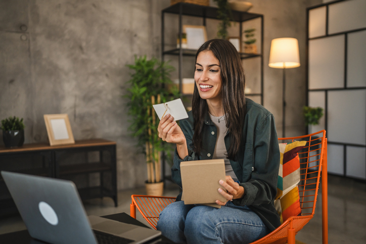 Adult woman open gift box and read greeting card and talk via video call on laptop