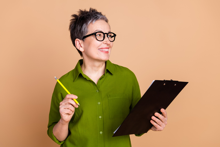 Photo portrait of attractive retired woman look empty space documents dressed stylish green clothes isolated on beige color background.